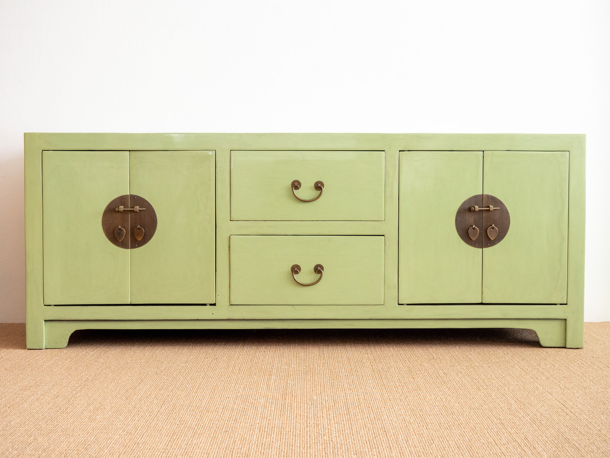 This lower-profile media console in solid wood and green sage gives an exotic vibe while still providing plenty of space to hide any components or cords with two drawers and two doors.
